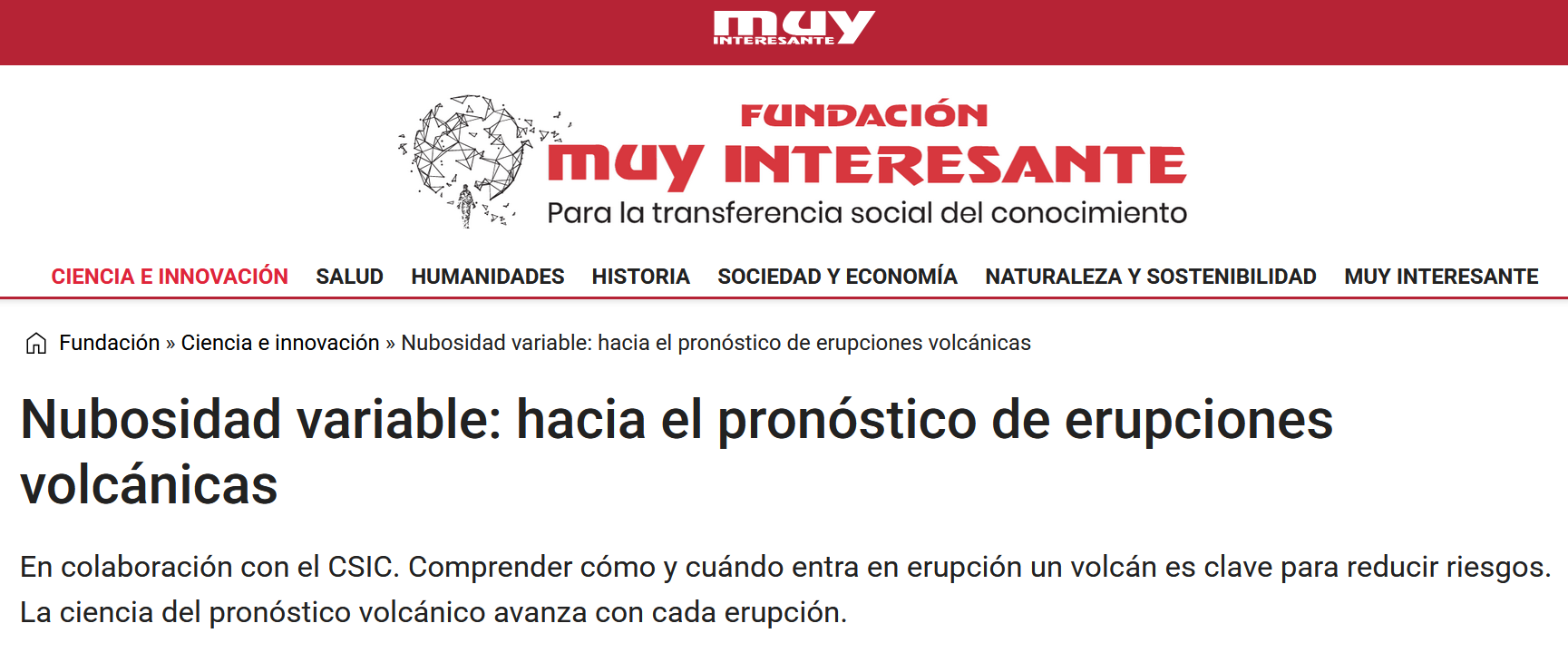Science outreach at the Muy Interesante magazine on science of forecasting volcanic eruptions [in Spanish].
